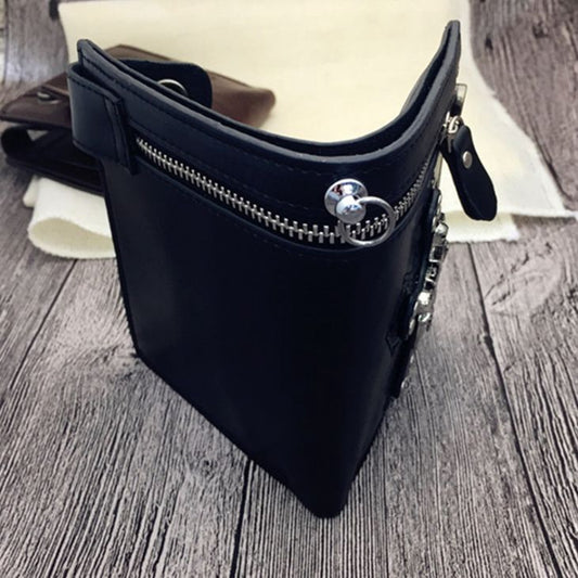 Brand New Men Vintage Short Purse Boys Goth Skull Head Cross Black PU Leather Biker Punk Snap Zipper Wallet with Long Key Chain
