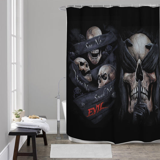No see no hear no speak evil halloween skull Shower Curtains
