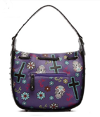 Western Sugar Skull Hobo Shoulder Bag with Drawstring Closure and Matching Wallet, Removable Crossbody Strap