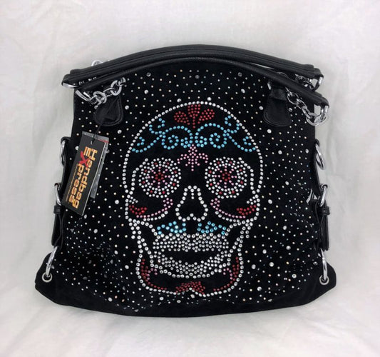 New Medium Sugar Skull Day of the Dead Rhinestone Fashion Handbag Tote Purse Bag