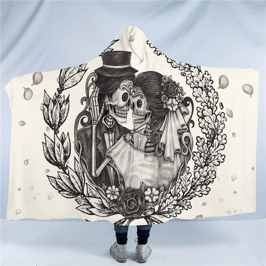 Skull Couple Hooded Blanket Vintage Gothic Sherpa Fleece Wearable Throw Blanket Floral Adults Home Textiles