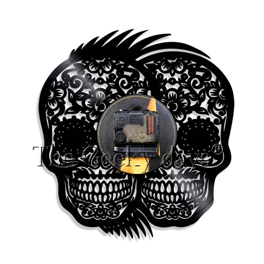 Two Skull Heads Halloween Wall Art Skeleton Heads Vinyl Record Wall Clock Home Decor Death Skulls Modern Wall Clock Handmade Art