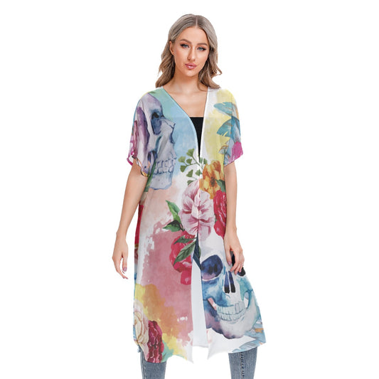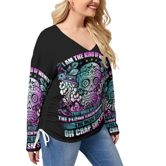 All-Over Print Women’s V-neck T-shirt With Side Drawstring(Plus Size)