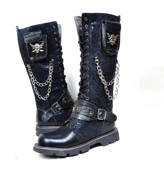 Black Army Gothic Boots Men Military Combat Metal Skull Buckle Motorcycle Punk High Leather Men's Shoes Rock Bota Masculina Hot