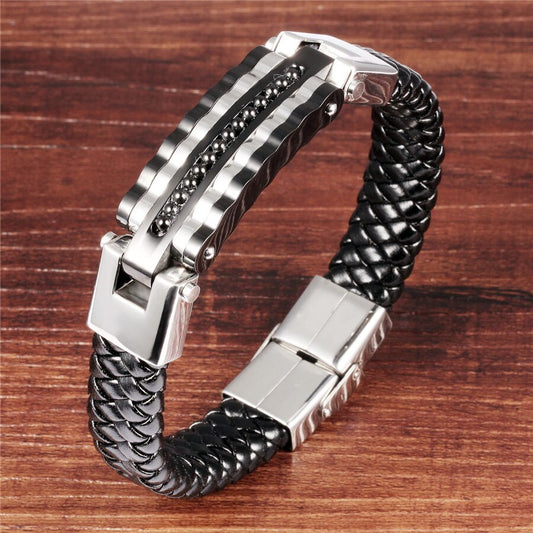 Black Leather Bracelet Men Charm Bangle Stainless Steel