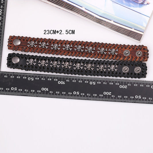 Black Brown Leather Metal Pirate Skull Charms Button Lock Wrap Unisex Bracelets 2 size