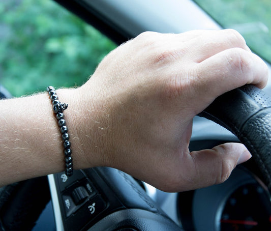 Black Hematite Stone Bead Bracelet Male Skull Charms Bracelet & Bangle Men Bijoux Nature Stone man bracelets bangles