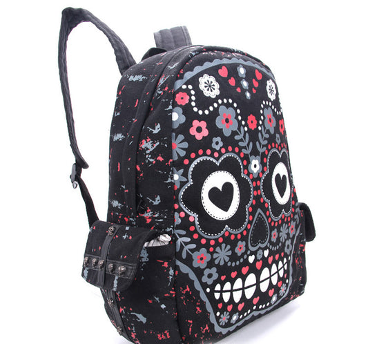 Men Women Unisex Sugar Flower Printed Skull Gothic Emo Punk Backpack Rucksack School Bag Pink Waterproof Mochila