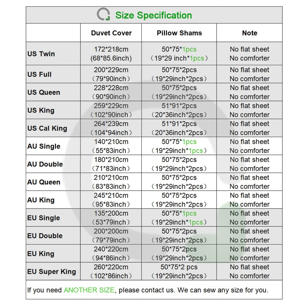 AU King: 1 Duvet Cover 95"x83"(245x210cm), 2 Pillowcase 19"x29"(50x75cm).