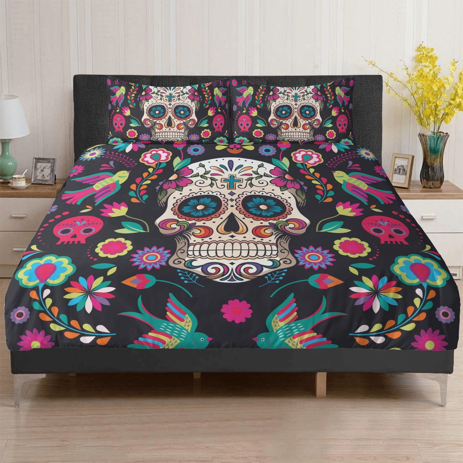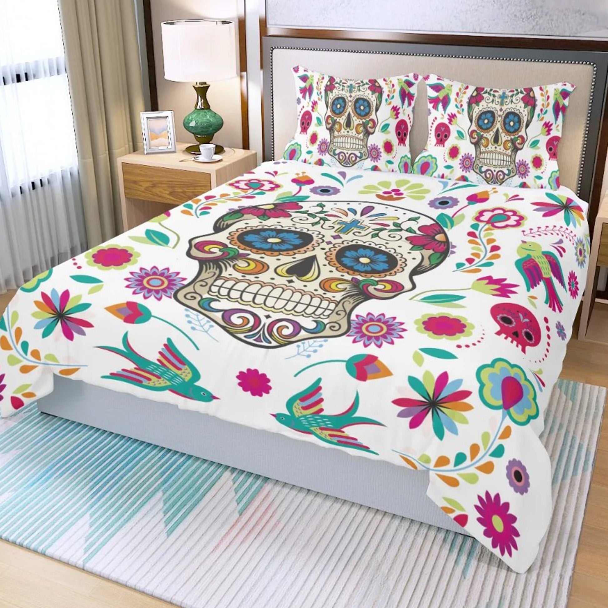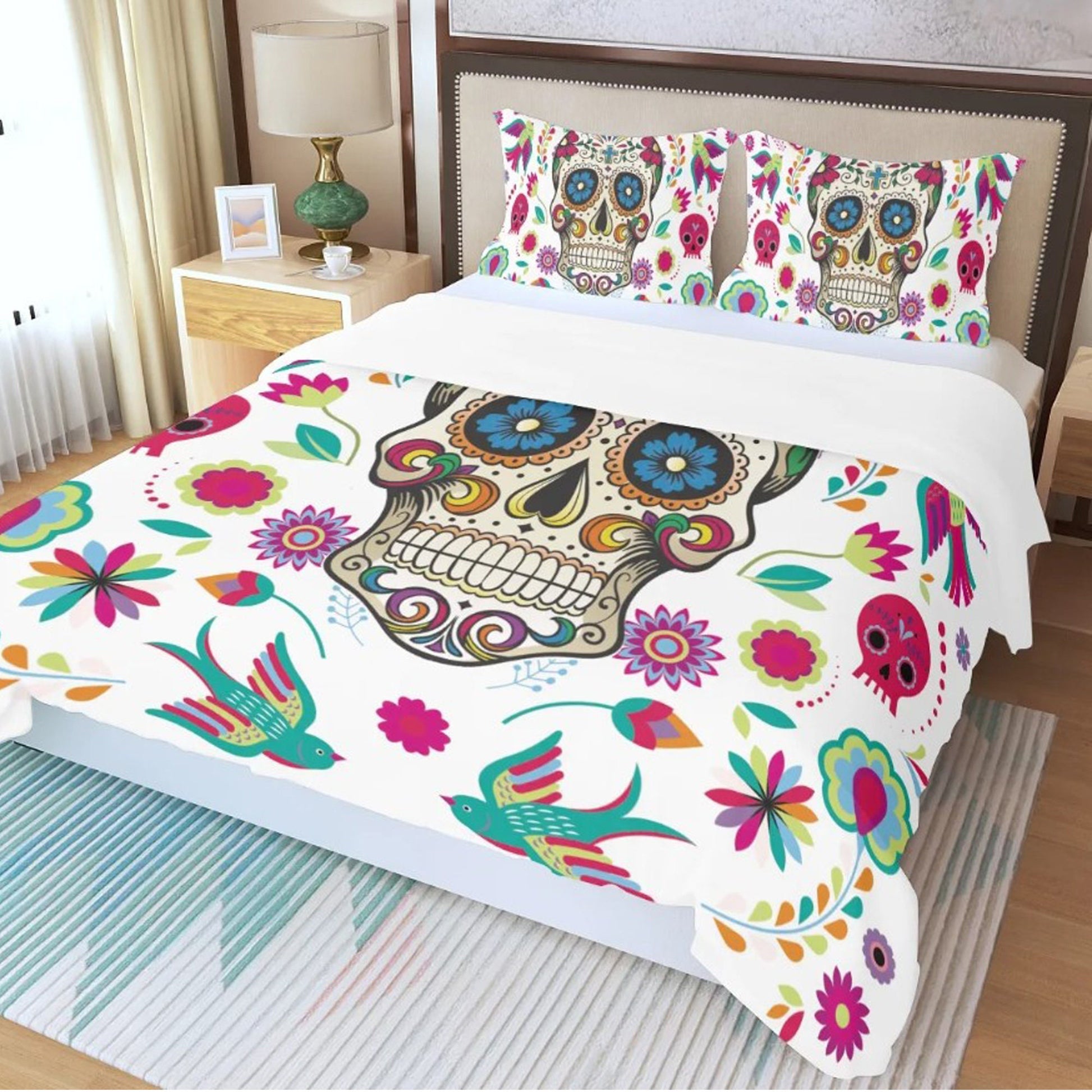 4pcs candy skull bedding duvet cover set, dia de los muertos skull bedding set, Mexican calaveras floral skull duvet cover pillow covers, 4pcs Floral sugar skull bedding duvet cover set, day of the dead skull bedding set, dia de los muertos sugar skull duvet cover pillow covers Washable and durable;Close skin fabric;Non-irritating;Good moisture absorption and breathability; Made of polyester Product includes one zippered duvet cover, one sheet and two pillowcases, inserts not included. Feature:Healthy Printing and Dyeing Care Instruction: machine washable use a mild detergent. Thread Color is white. Custom area is Single-sided printing. This product is made on demand. No minimums. Multiple shipping options available, and cost varies on time efficiency. Size unit inch Size_Detail_____UST__________USF__________USQ_________USK___________USC Quilt Cover_____67.7x85.8___79.9x89.8___89.9x89.9___102.4*90.6___103.9x94.1 pillowcase______19.7x28.3___19.7x29.5____19.7x29.5_____20.1x35.4____20.1x35.8 Sheet___________66.9x90.6___82.7x90.6___90.6x98.4___98.4x106.3___92.1x98.4 ======== All products in our store are only manufactured upon receiving an order from the customer. Please carefully review the product description and dimensions in the illustrative images before placing an order. The following cases are not eligible for return/exchange: 1. The product you receive matches the description. 2. The product dimensions (with illustrative images describing the dimensions) you receive match the description. 3. The product has been customized as per your request (e.g., printed with your name/image).