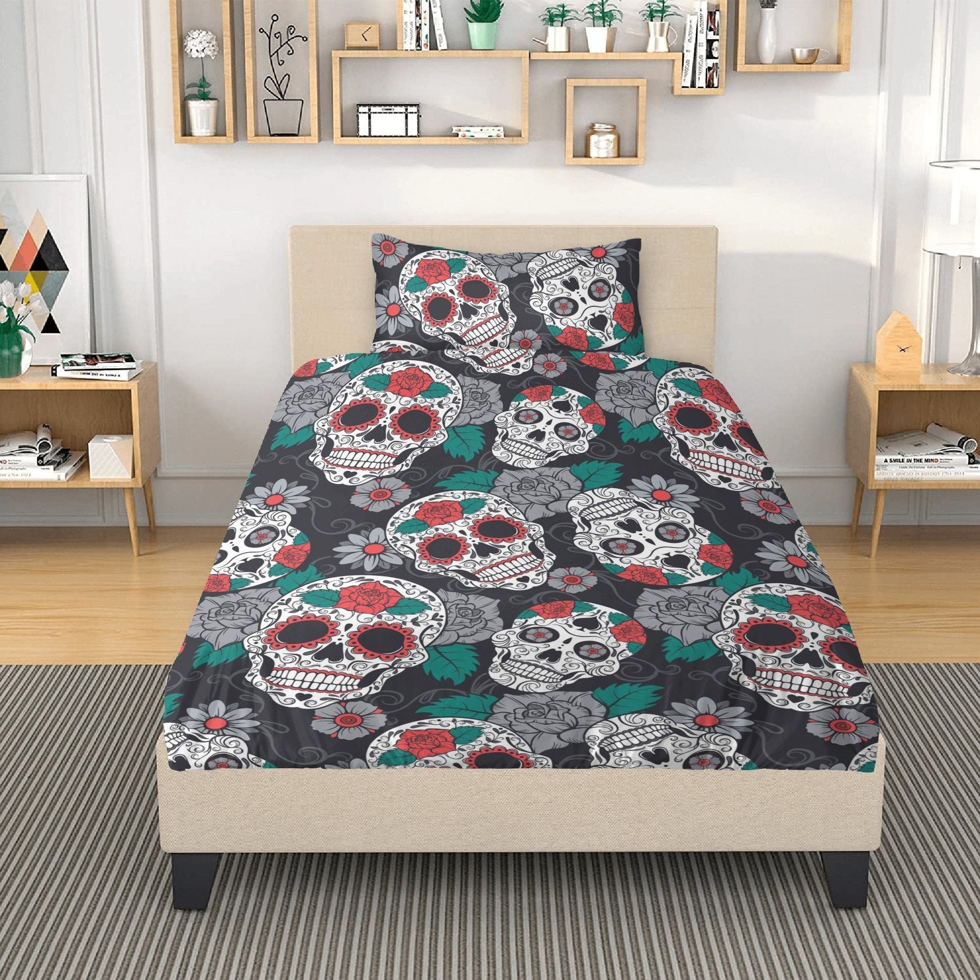4pcs Floral sugar skull bedding duvet cover set, day of the dead skull bedding set, dia de los muertos sugar skull duvet cover pillow covers
