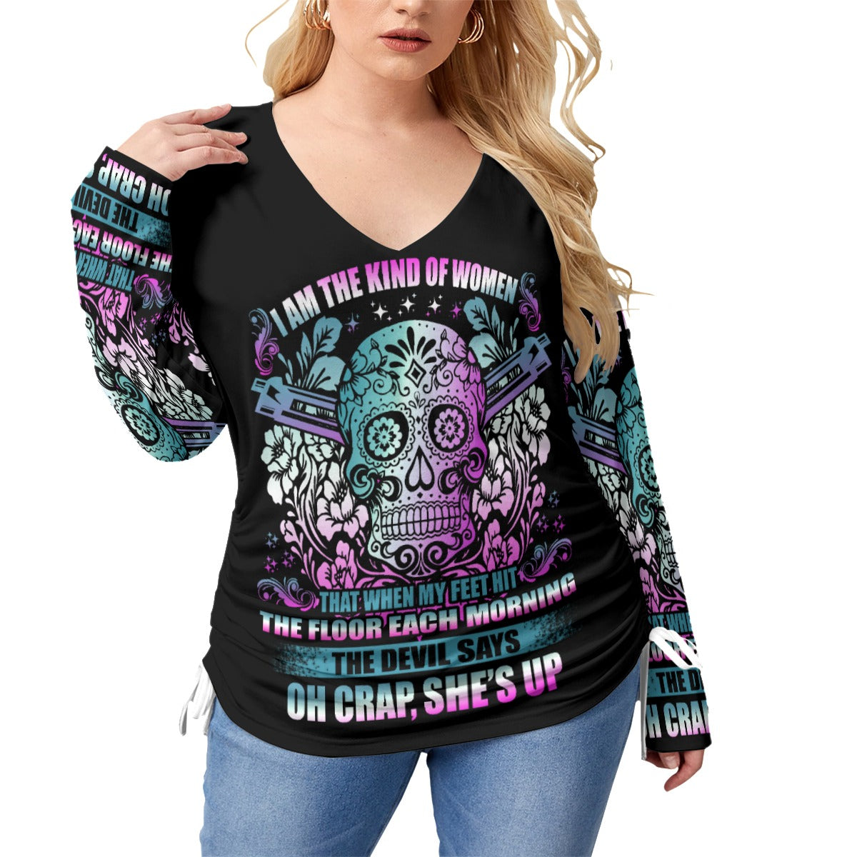 All-Over Print Women’s V-neck T-shirt With Side Drawstring(Plus Size)