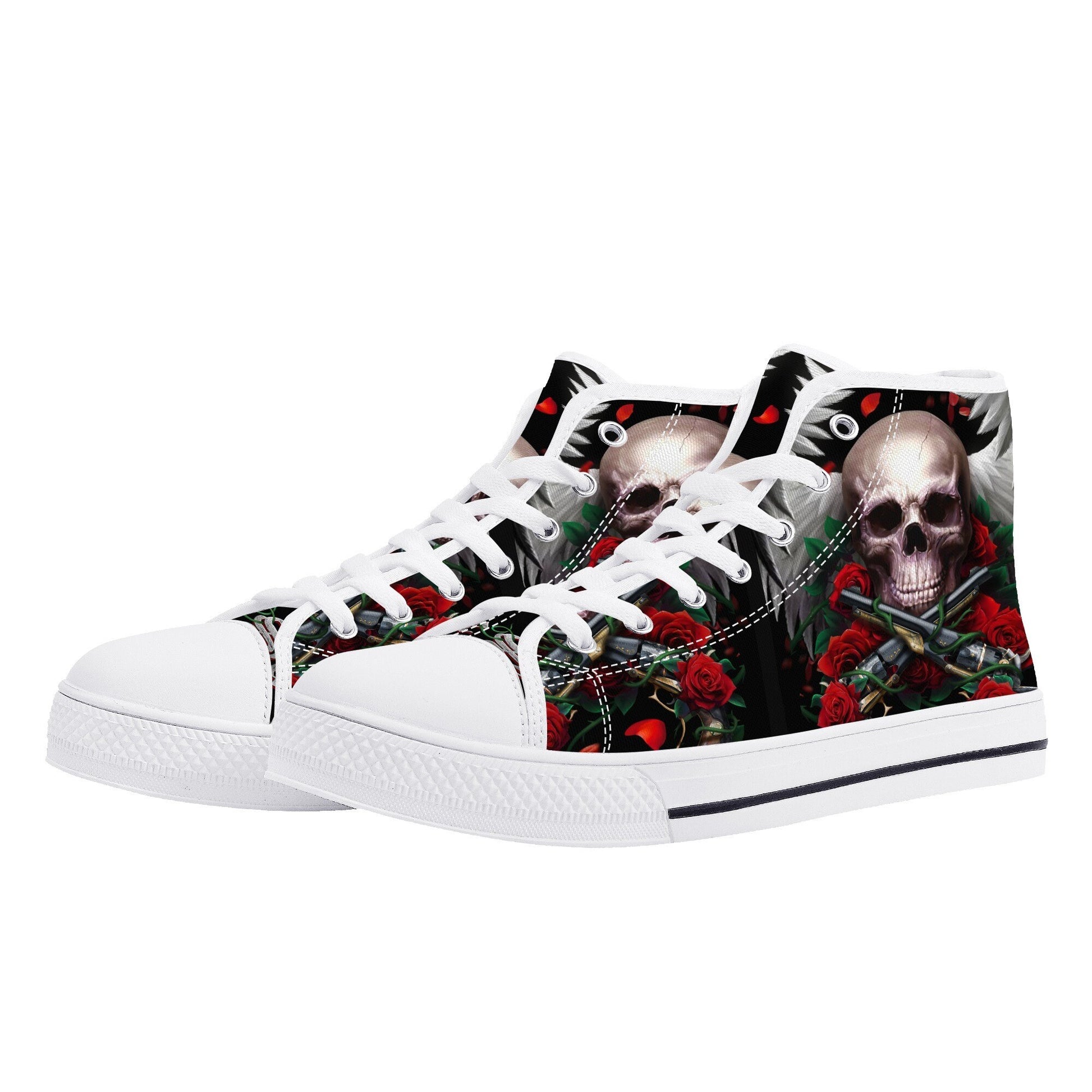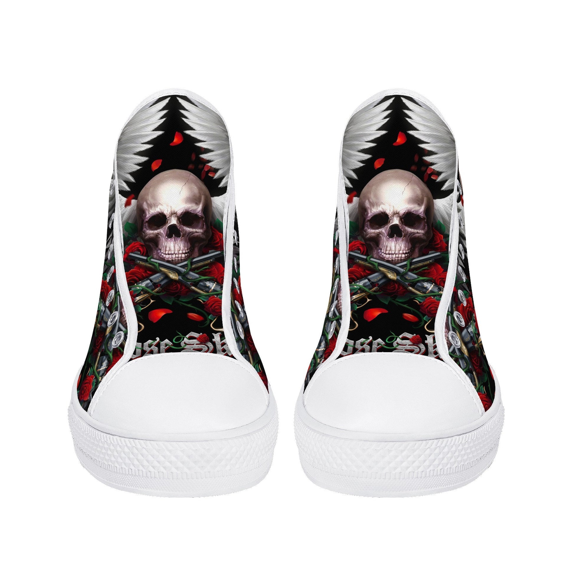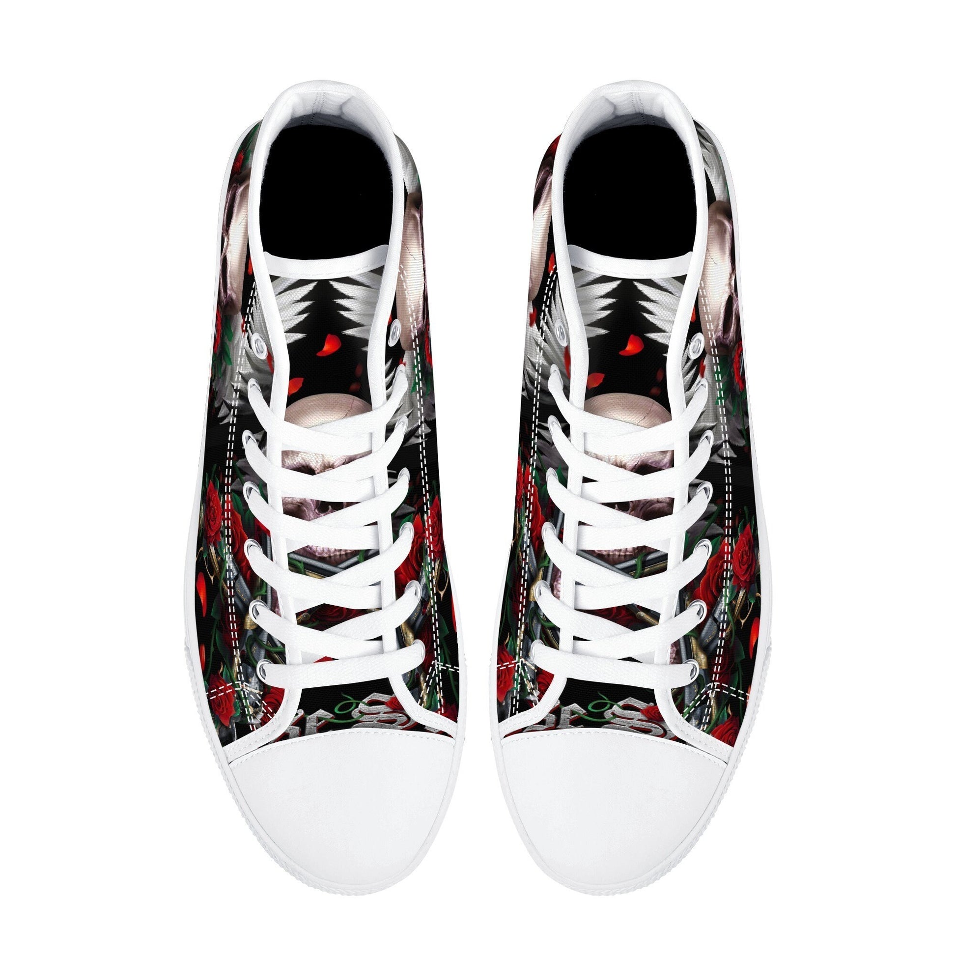 Floral skull high top shoes, punisher skull women shoes, motorcycle skull causual sneakers, skull in fire causual shoes, skeleton women sneakers, flaming skull shoes for him, flower skull men sneakers, skull women shoes, christmas skull sneakers shoes