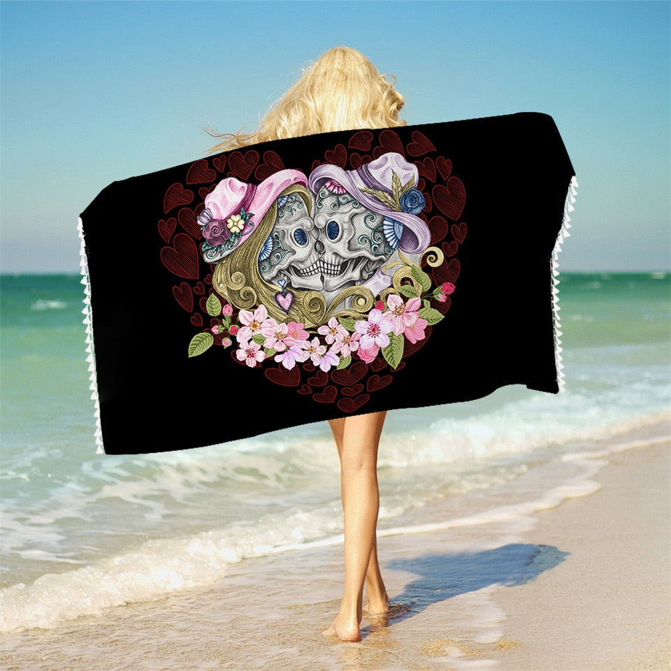 Skull Couples Bathroom Towel With Tassels Microfiber Red Hearts Gothic Beach Towel