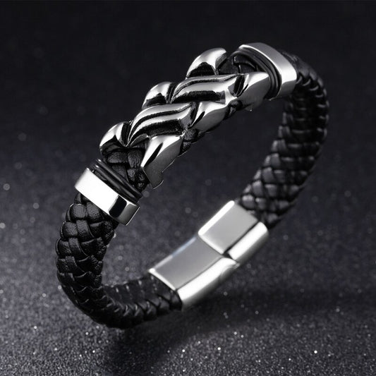 viking slavic Cowhide bracelet men Black Braided Leather Cuff Stainless Steel