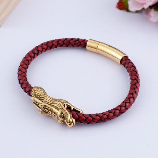 Dragon Charm Bracelets For Men 22cm Gold Stainless Steel + Red Leather Rope