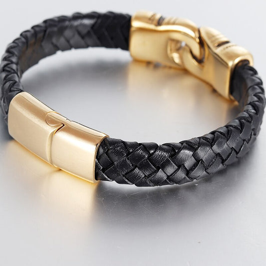 Hot Selling Men's Leather Bracelet Gold Stainless Steel