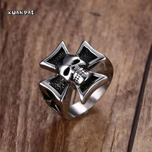 Male Rings in Silver Tone Stainless Steel Hell Rider Iron Cross with Skull Jewels For Men Gothic Punk Rock Party Biker Jewelry