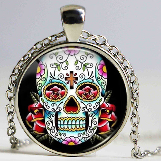 Vintage Floating Locket Bronze Chain Statement Necklace Art Picture Sugar Skull Glass Cabochon Gothic Necklaces & Pendants