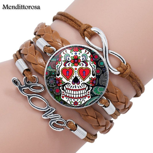 Mendittorosa Mexican Sugar Skull Color Jewelry With Glass Cabochon Multilayer Black/Brown Leather Bracelet Bangle For Women