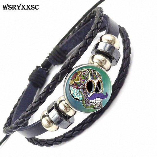 Sugar Skull For Women Girls Handmade New Brand Jewelry With Glass Caochon Black Leather Bracelet Bangle
