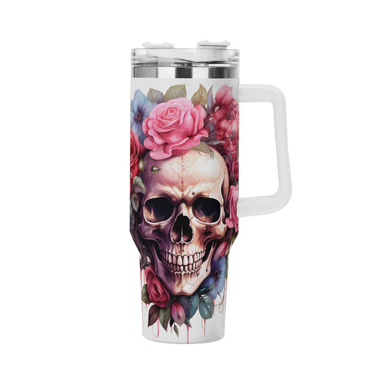 Floral Skull 40 oz Tumbler - Pink Rose Skeleton skull Drinkware - Skeleton Gothic Boho Insulated Cup with Handle - skull Gift for Her
