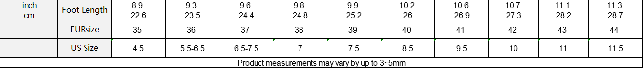 | US Size | 4.5 | 5.5 | 6.5 | 7 | 7.5 | 8.5 | 9.5 | 10 | 11 | 11.5 | |