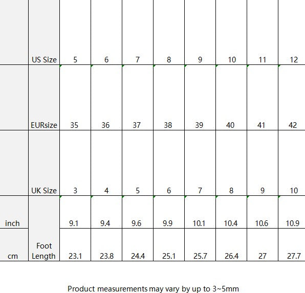 | US Size | 5 | 6 | 7 | 8 | 9 | 10 | 11 | 12 | |