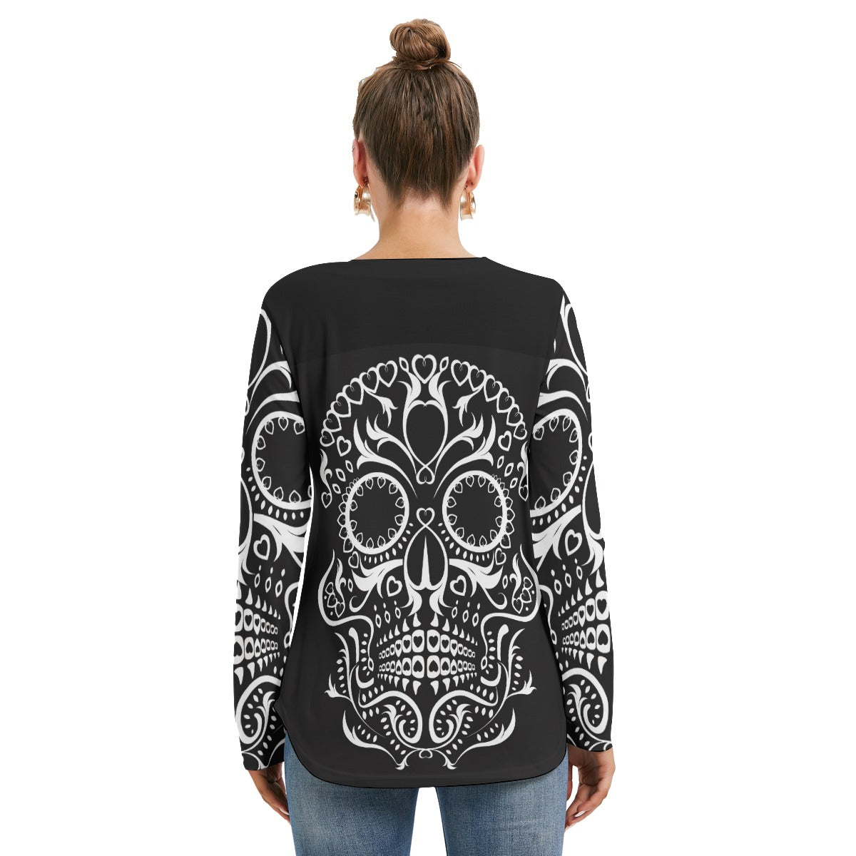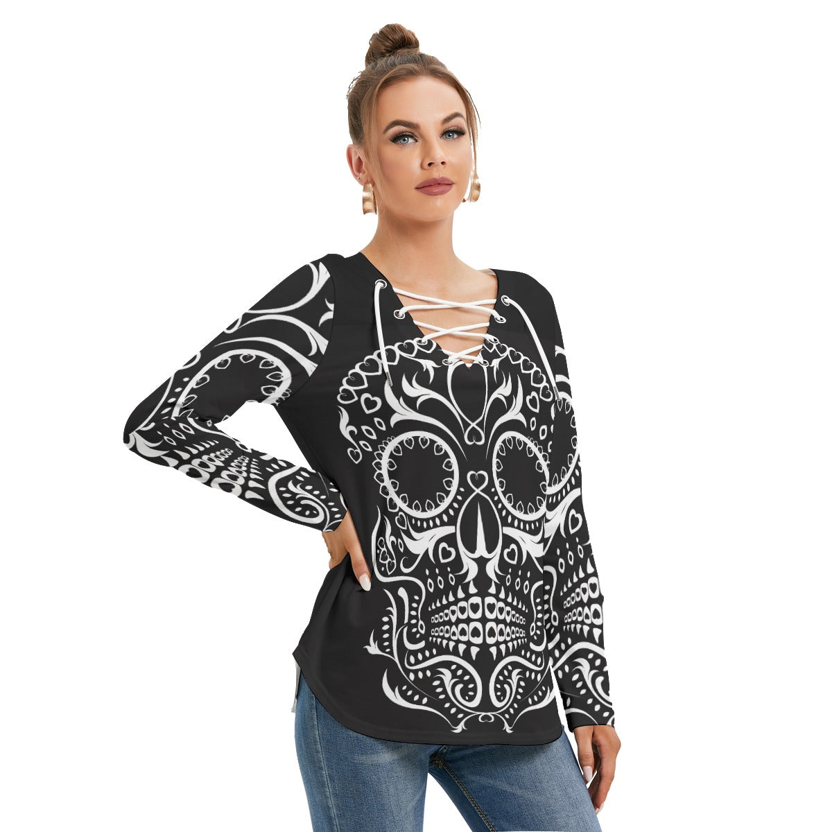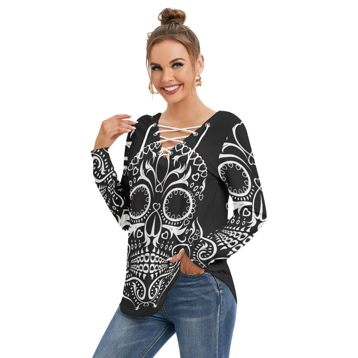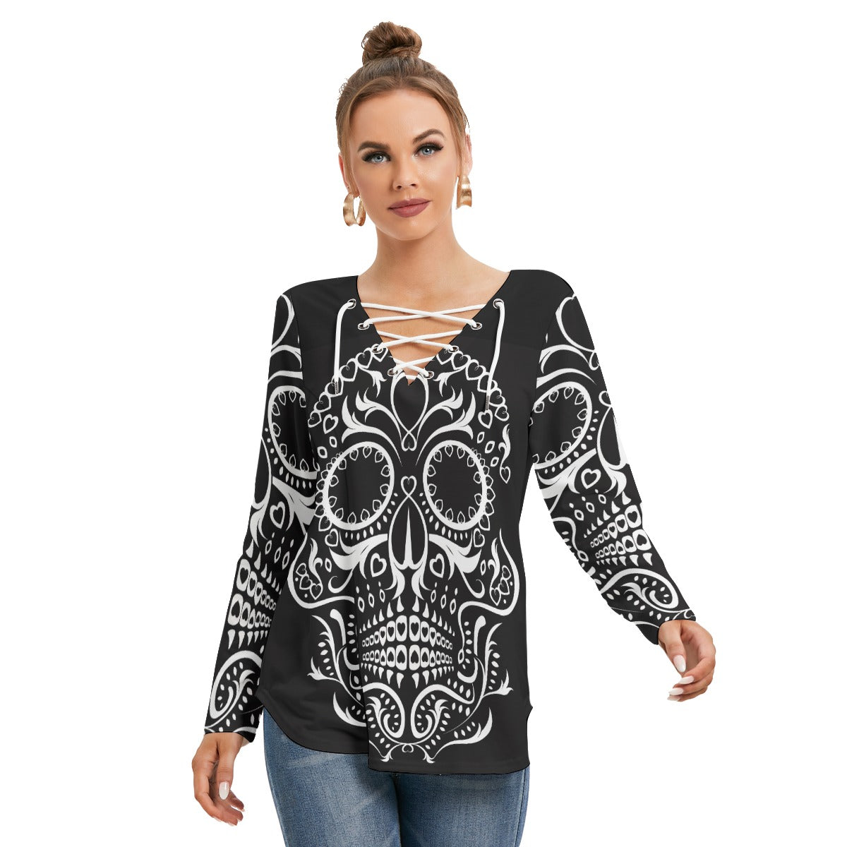 Day of the dead skull Women's Long Sleeve Neckline Tie Sweatshirt