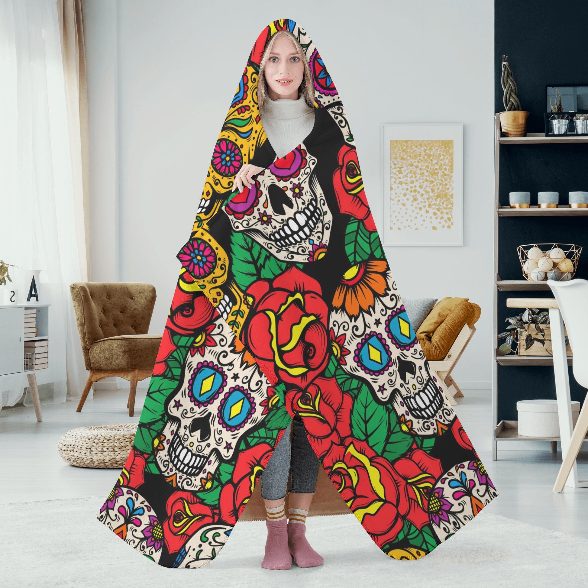 Dia de los muertos skull flannel hooded, mexican skull blanket hoodie, candy skull flannel hooded, sugar skull girl blanket hooded, floral s