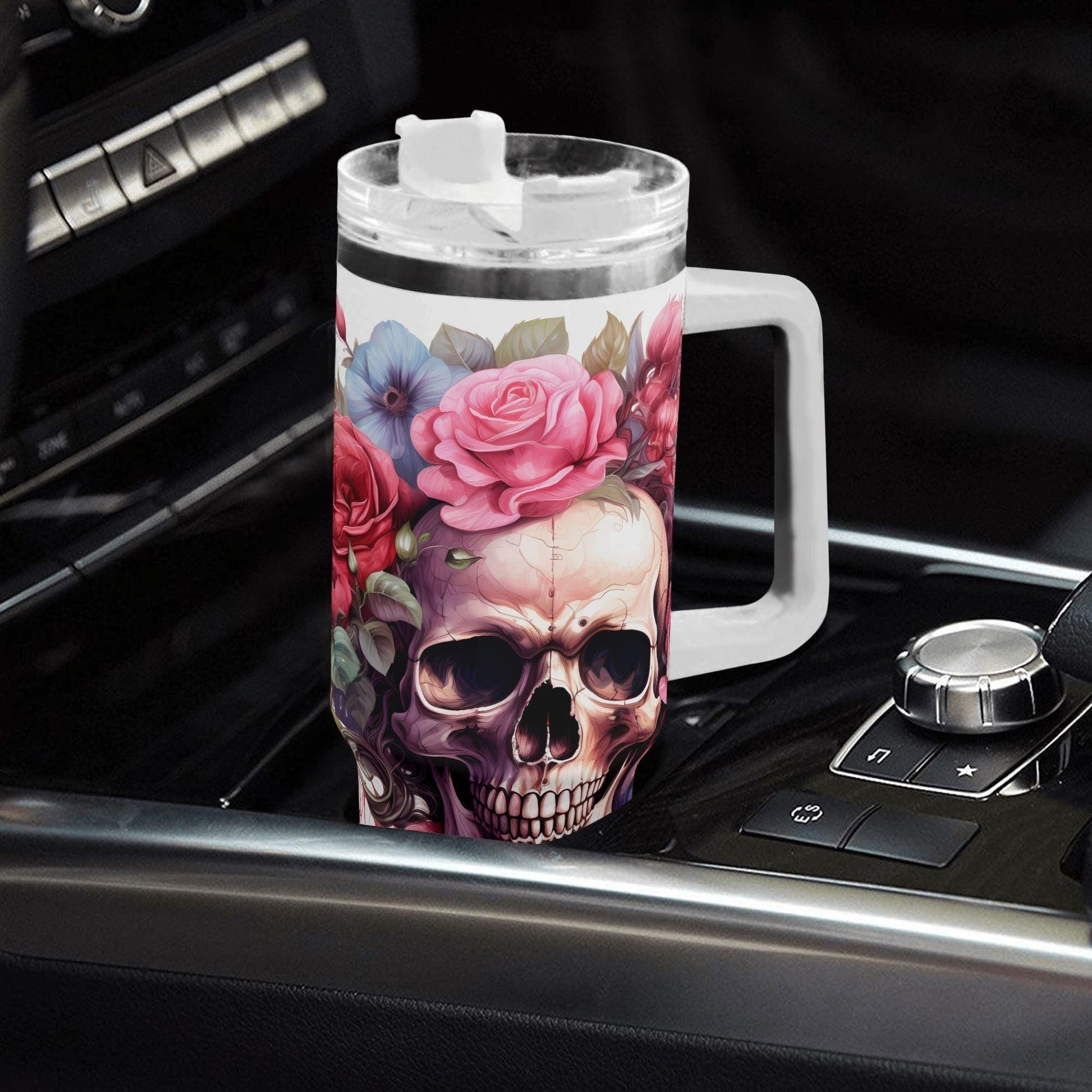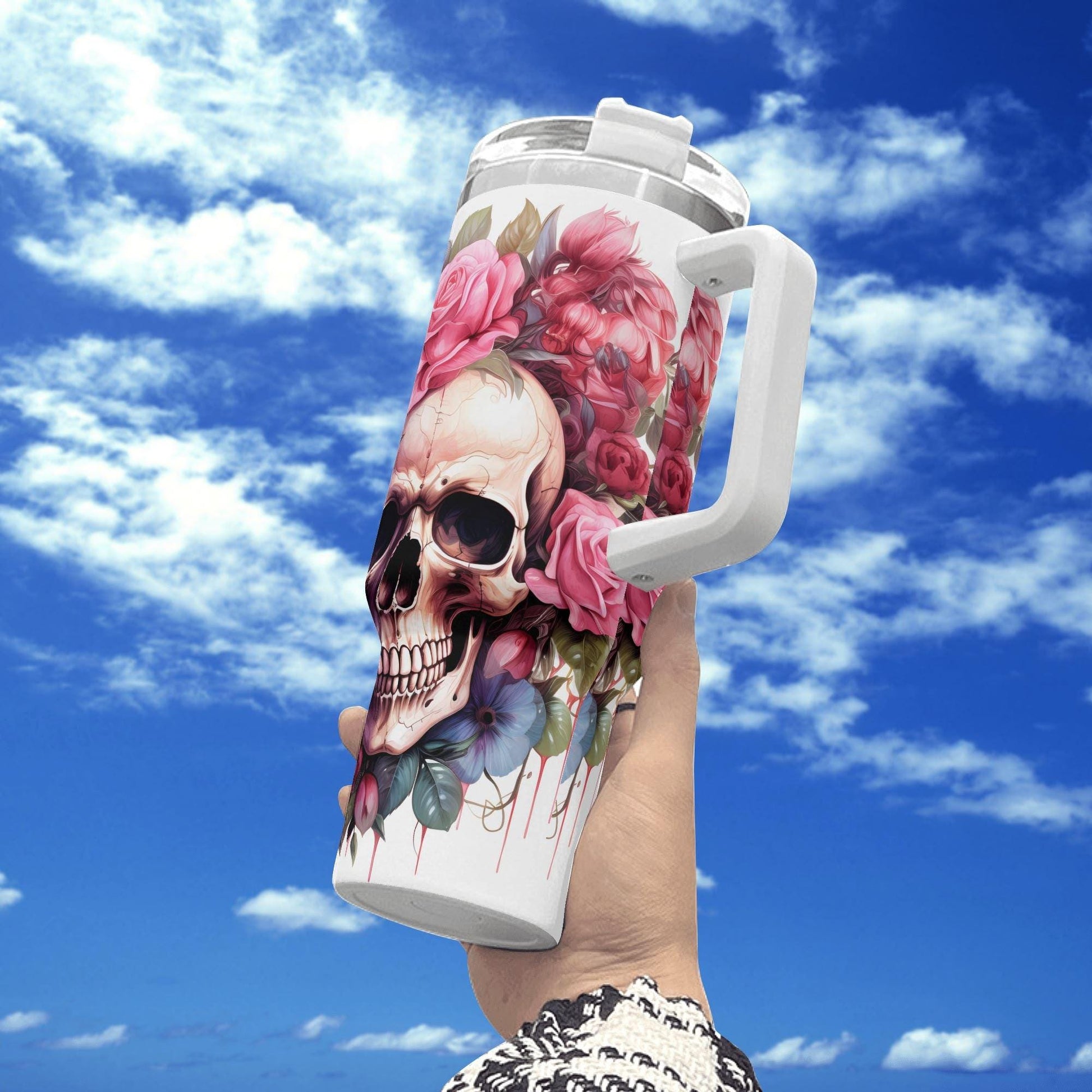 Floral Skull 40 oz Tumbler - Pink Rose Skeleton skull Drinkware - Skeleton Gothic Boho Insulated Cup with Handle - skull Gift for Her