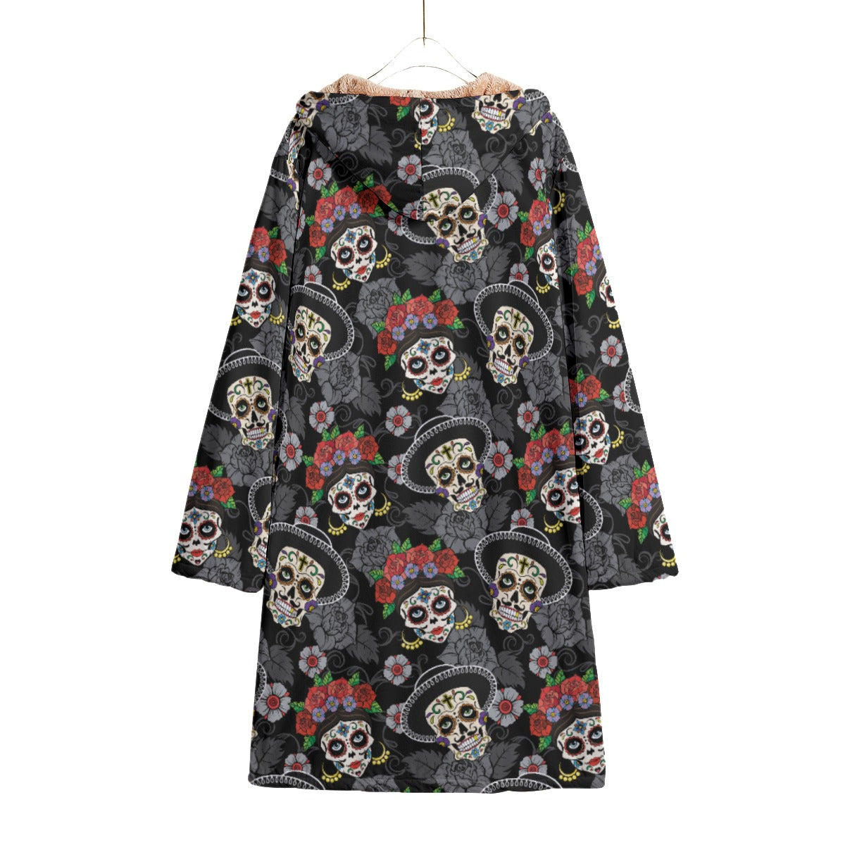 Floral sugar skull candy skull day of the dead cloak Horn Button Long Fleece Windbreaker, Dia de los muertos skull cloak Horn Button Long Fleece Windbreaker