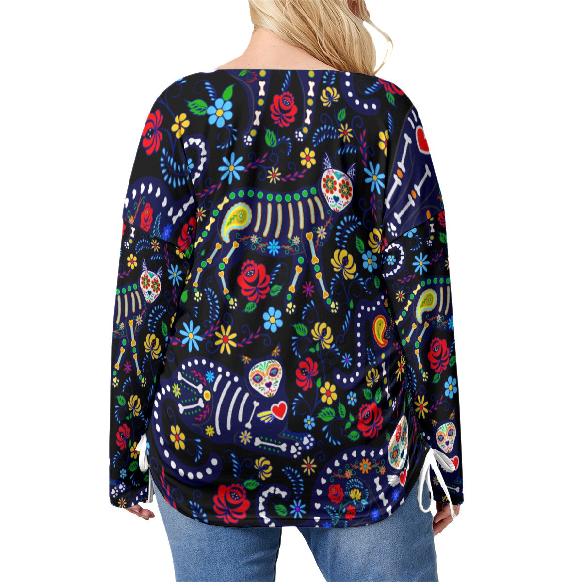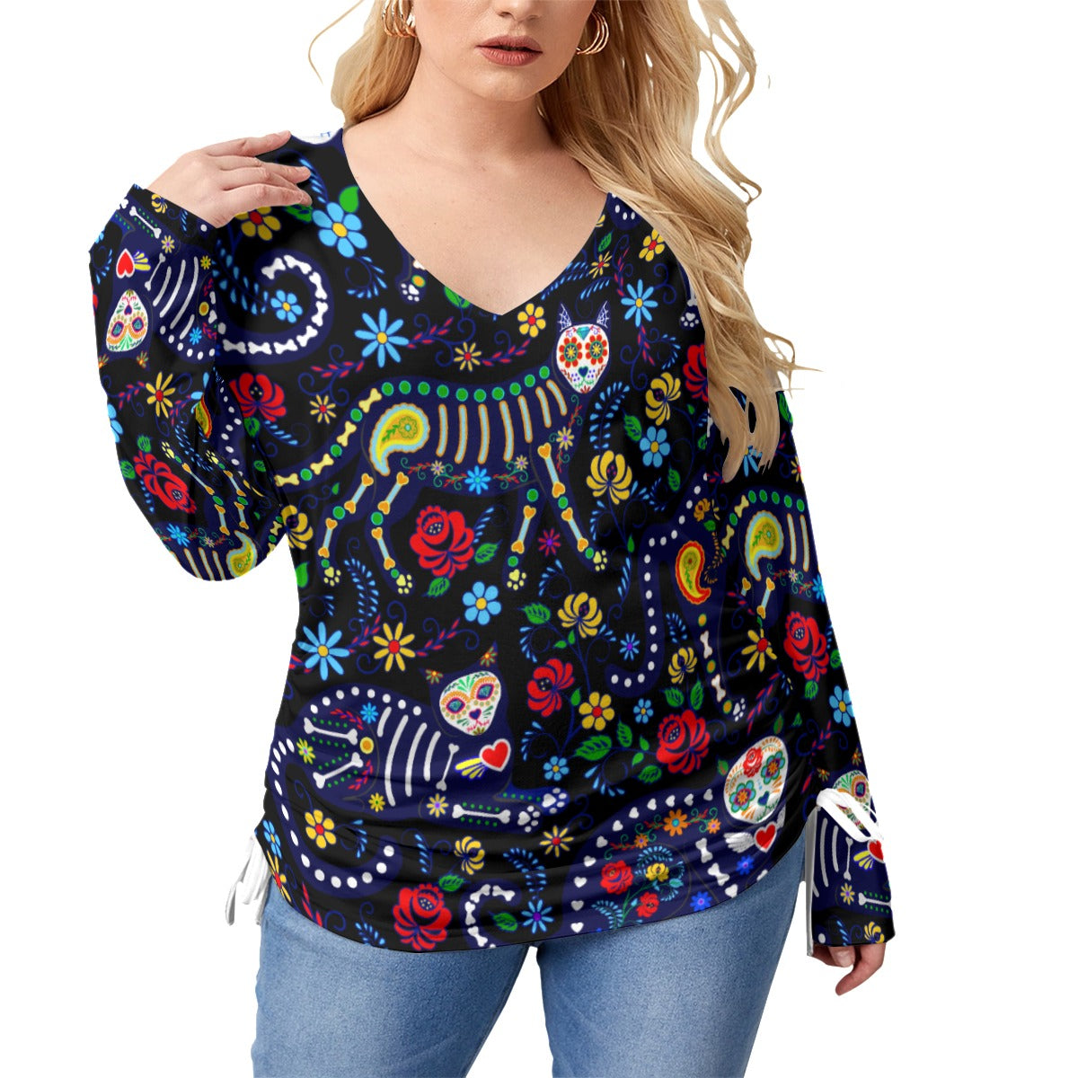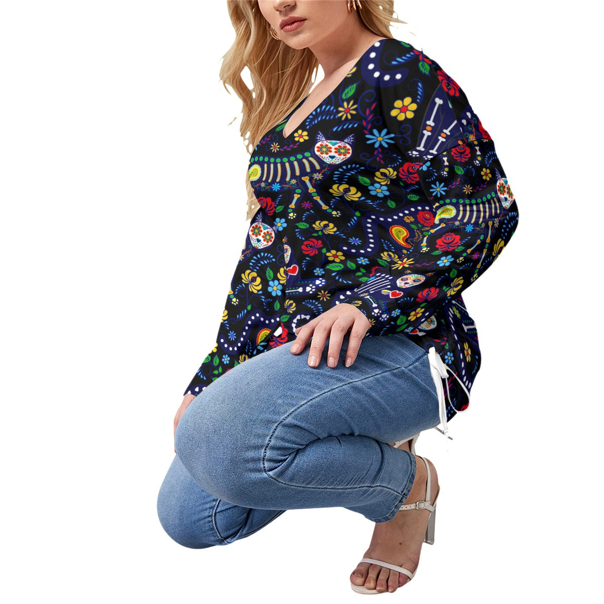 Sugar skull cat Women’s V-neck T-shirt With Side Drawstring(Plus Size)