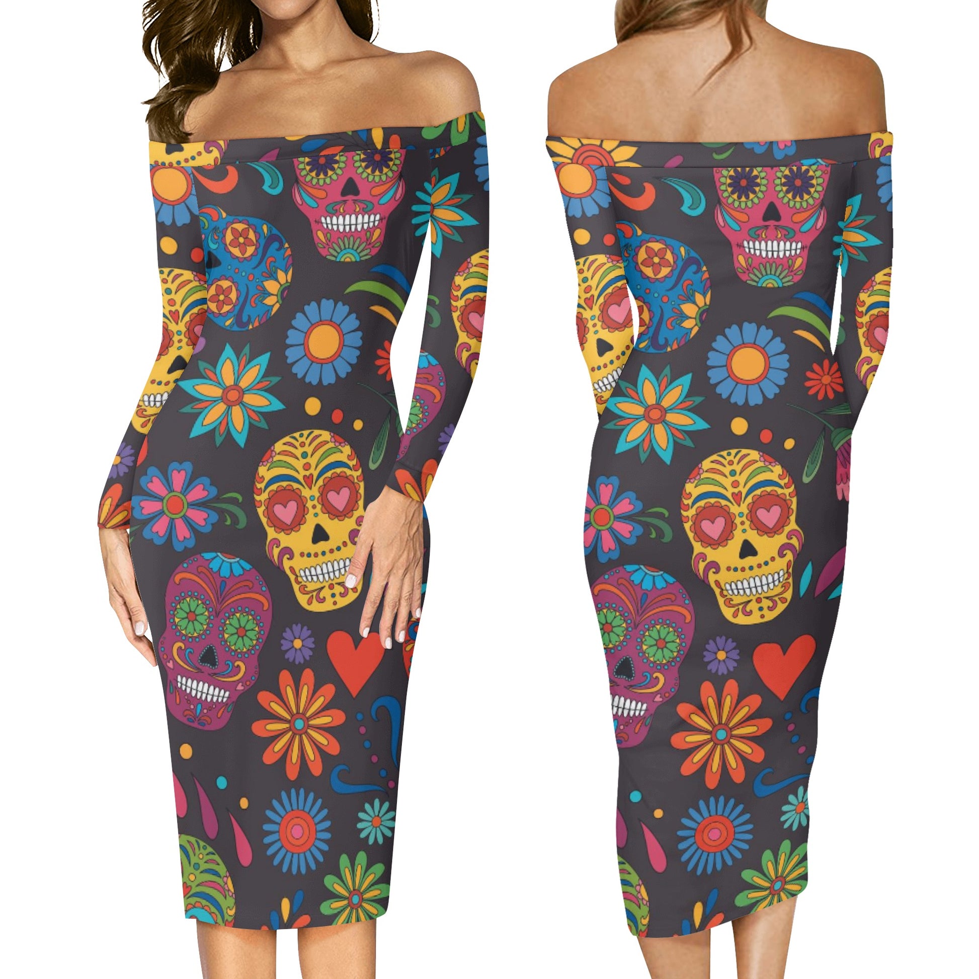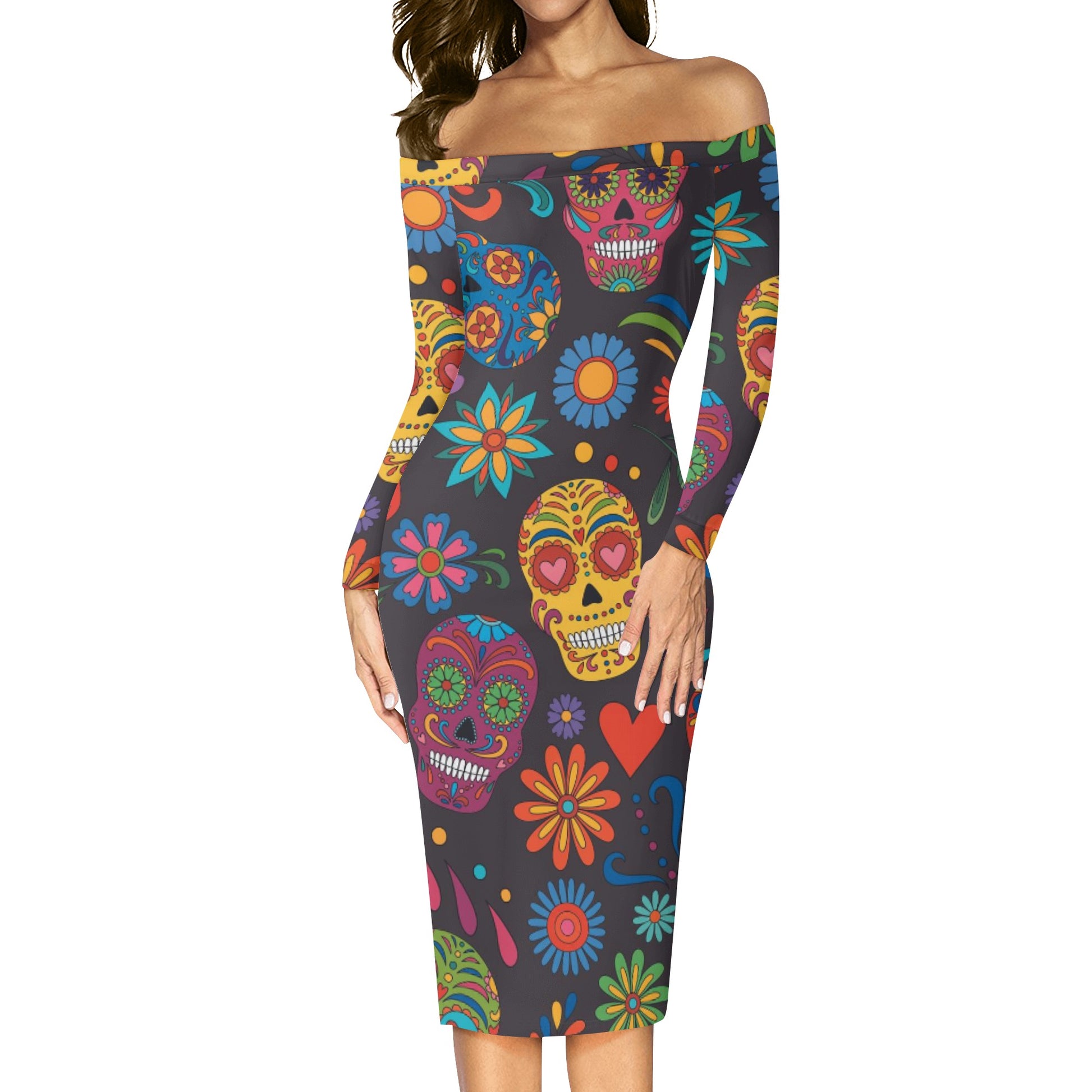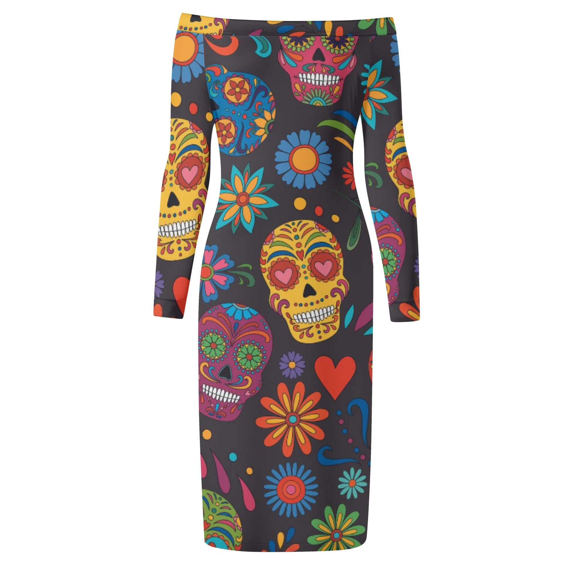 Sugar skull Day of the dead Mexican skull Women's Long Sleeve Off The Shoulder Lady Dress