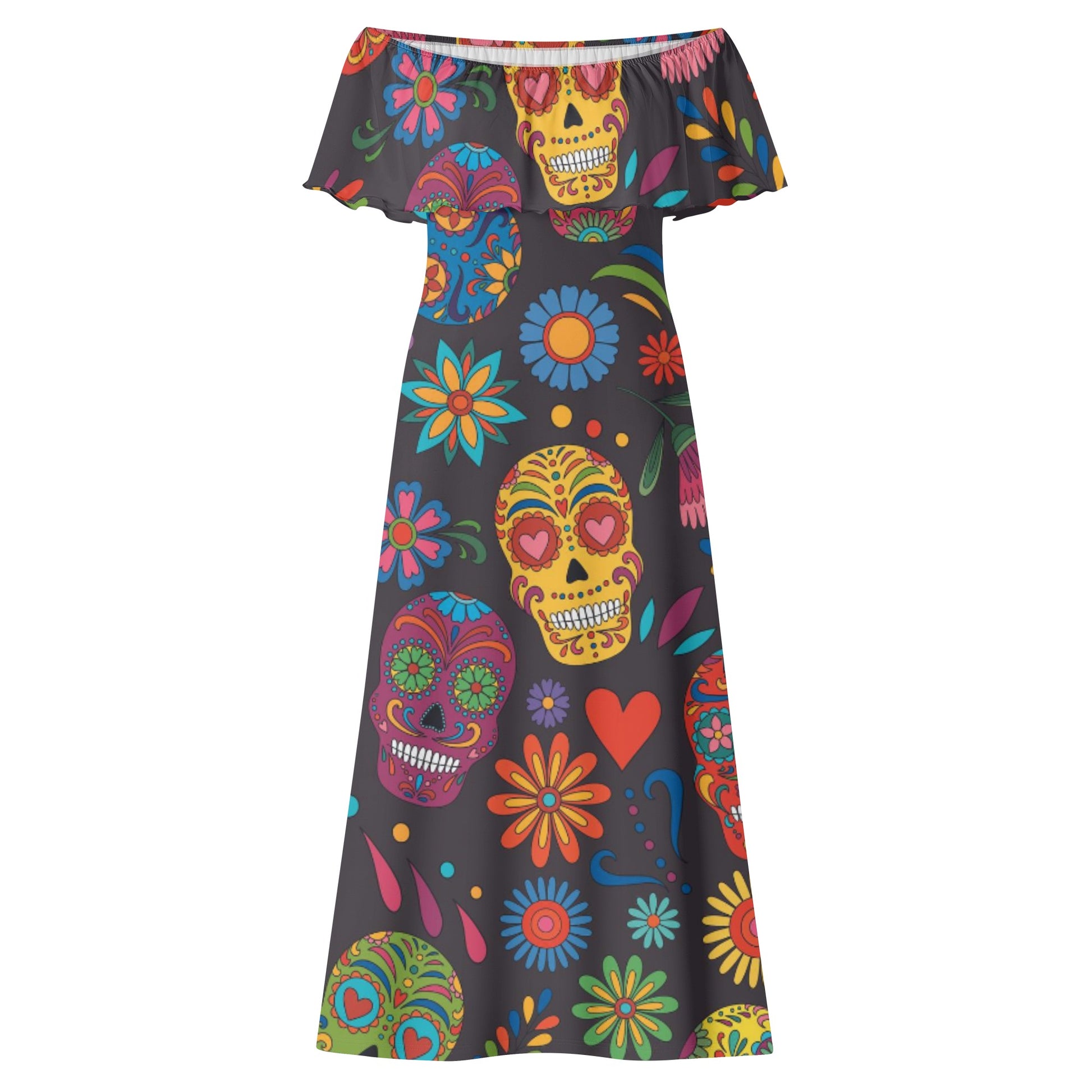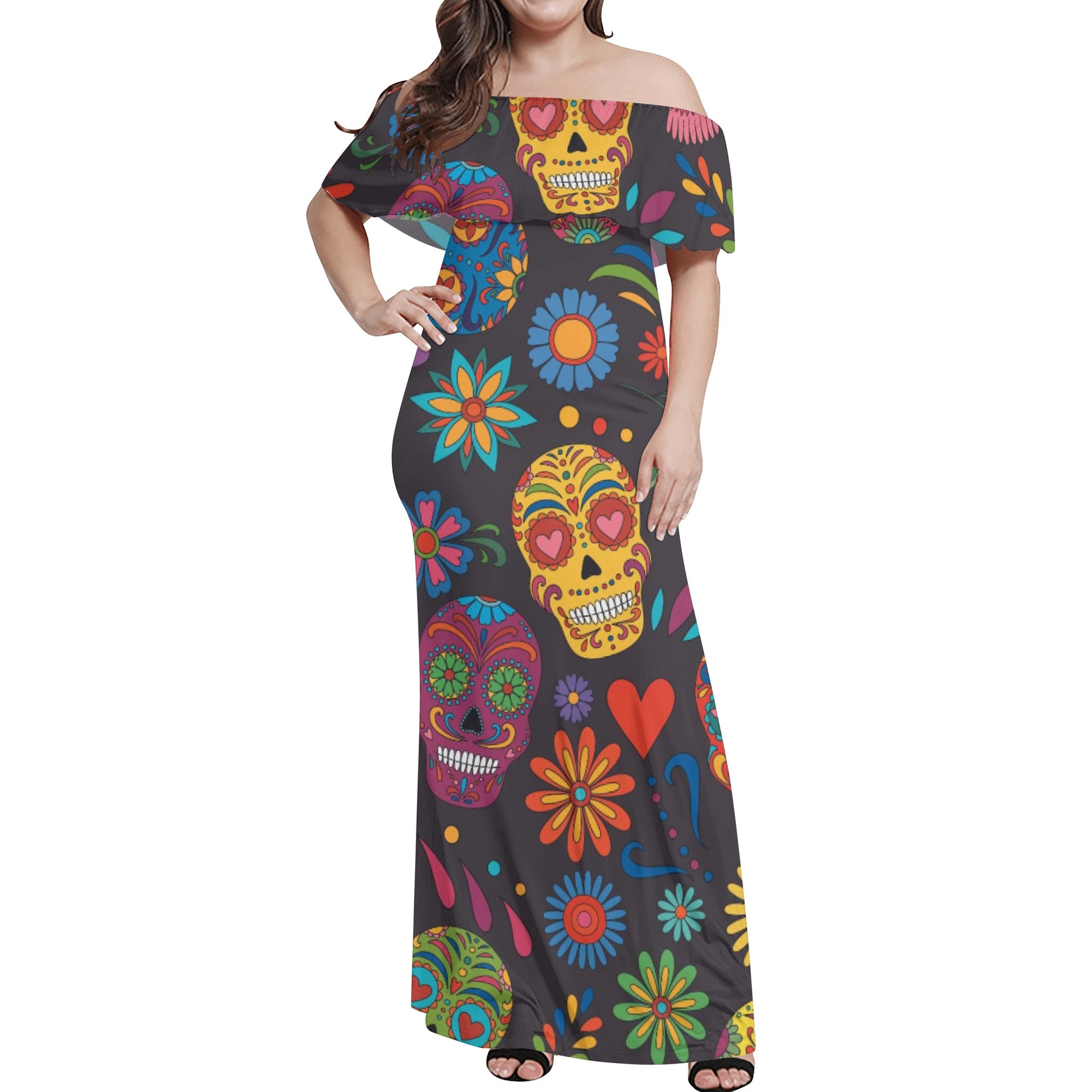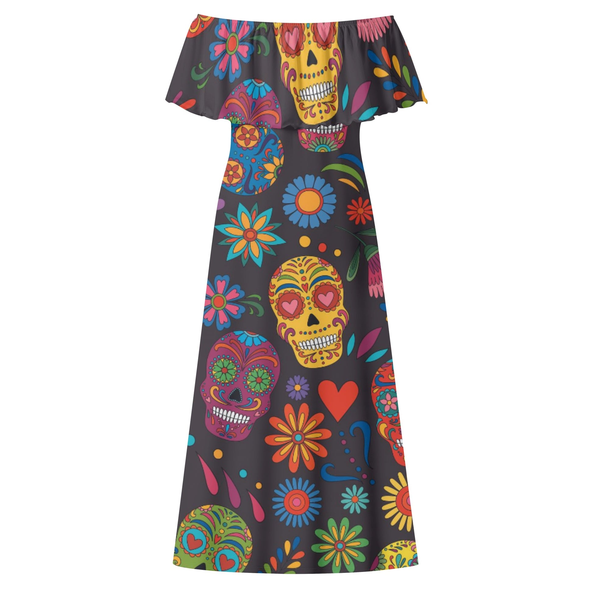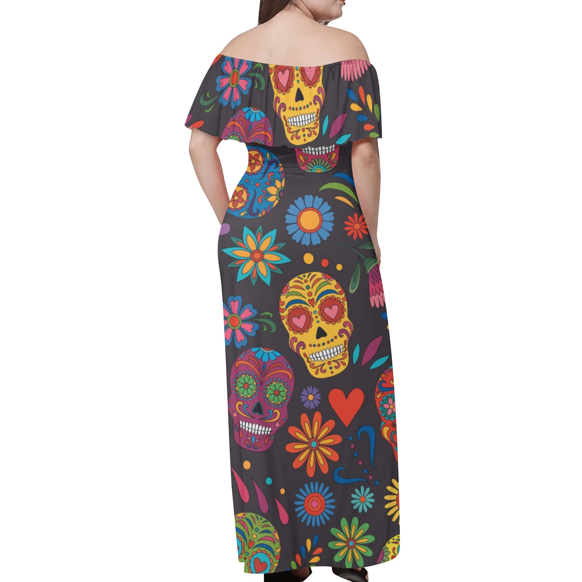 Sugar skull Day of the dead Mexican skull Women's Off-shoulder Long Dress
