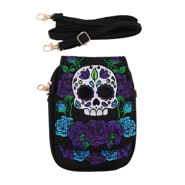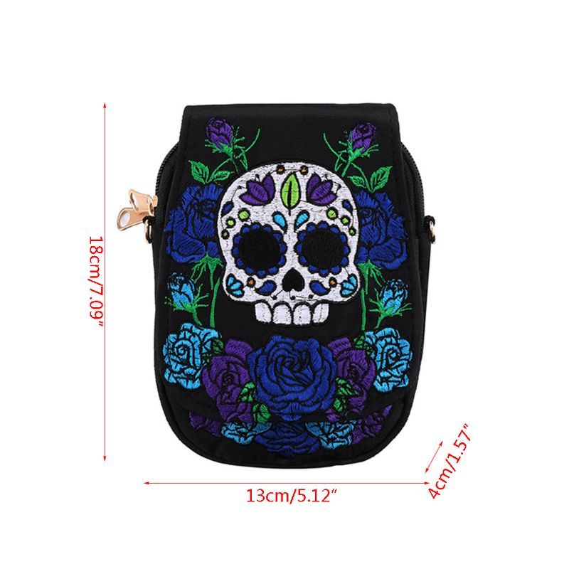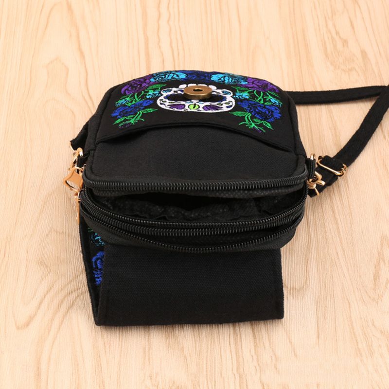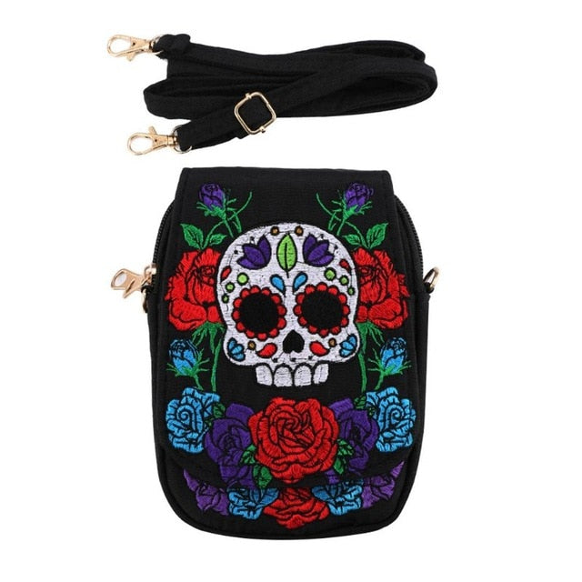 Women Skull Rose Handbag Canvas Embroidery Ethnic Shoulder Bag