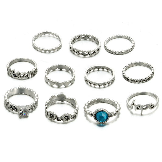 Vintage Silver Letter Flower Heart Knuckle Rings for Women Blue Crystal Carved Finger Midi Rings Set 11pcs 4229