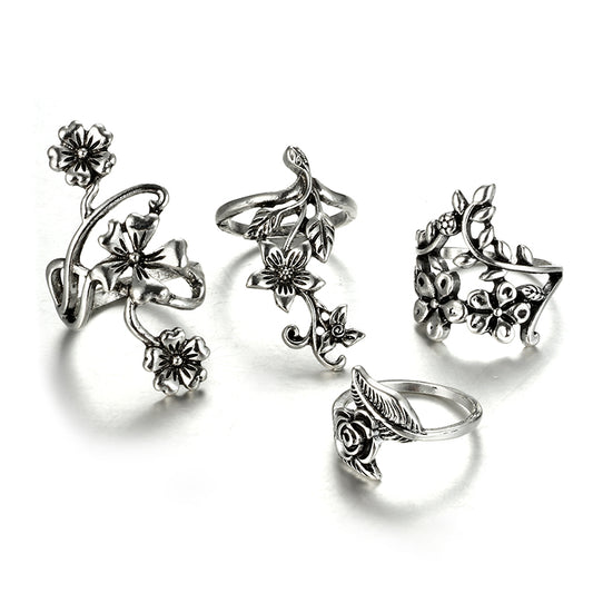Vintage Rose Flower Rings Set for Women Girl Bohemia Antique Silver Color Midi Rings Set Floral Knuckle Ring 6047