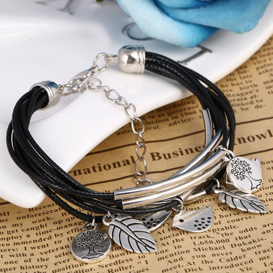 Black/Brown/Beige Colors Multi Layers Leather Bracelet Women Handmade Charm Bangle Mini Birds Pendant Wrist Bracelet