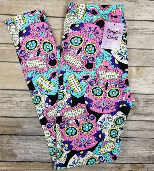 Colorful Candy Sugar Skull Leggings Skeletons Print ONE SIZE OS 2-10