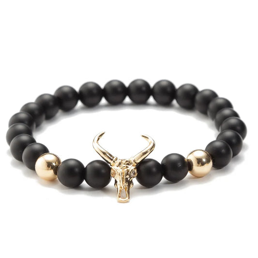 Punk CZ Bull Head Skull Men Bracelet Fashion 8MM Lava Stone Beads Charm Bracelets & Bangles Macrame Strand Jewelry Gift