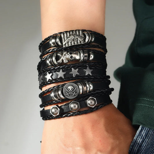 Fashion Viking Punk Bracelet For Men Hand Bracelets Multi-Layer Woven Skull Head Star Accessories Jewelry Leather Set Gifts