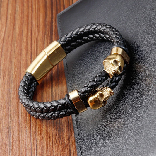 Skull Stainless Steel Fashion Punk Genuine Leather Rope Gold Bangle Magnetic Buckle Jewelry Trend 2024 Wholesale