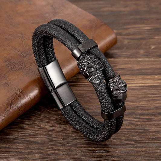 MKENDN Gothic Style Men Vintage Devil Fish Skin Leather Bracelet Double Skull Pave CZ Bracelets Handmade Jewelry Pulseras