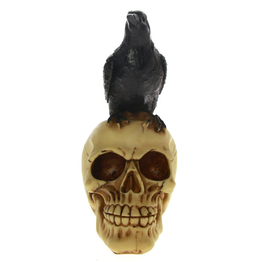 Grim Gothic Perched Raven on Skull Statue Black Bird Crow Skeleton Figurine