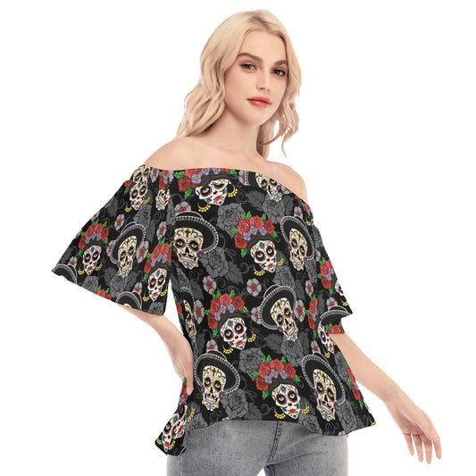 Day of the dead sugar skull Women's Off-shoulder Flared Sleeves Dress