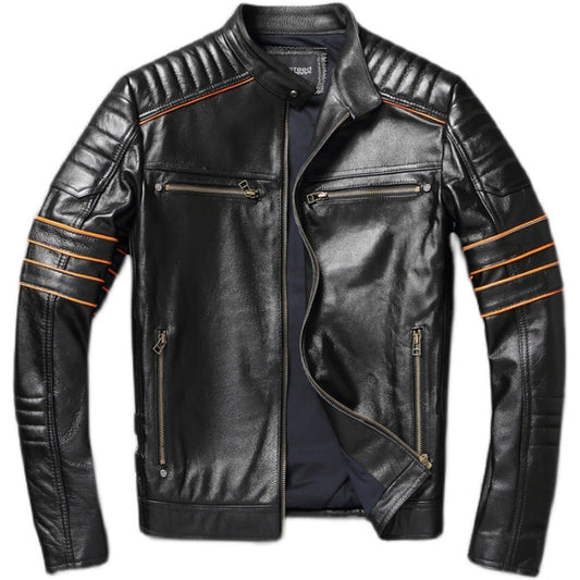 New Skull Embroidery Men's First Layer Cowhide Leather Jacket Motorcycle Slim Oversize Coat