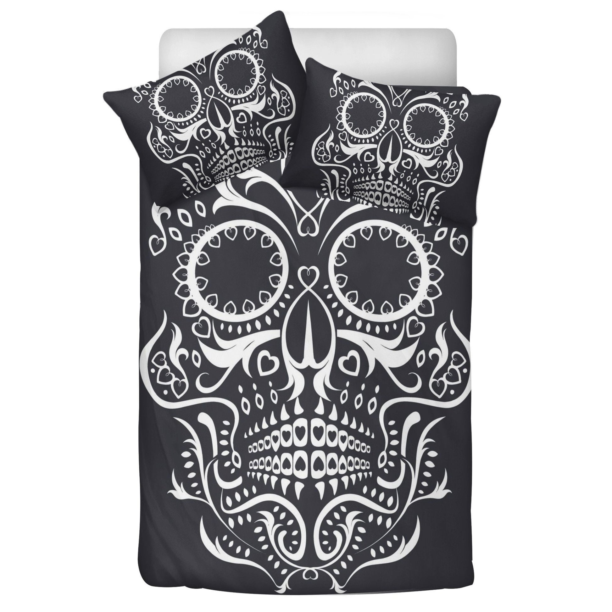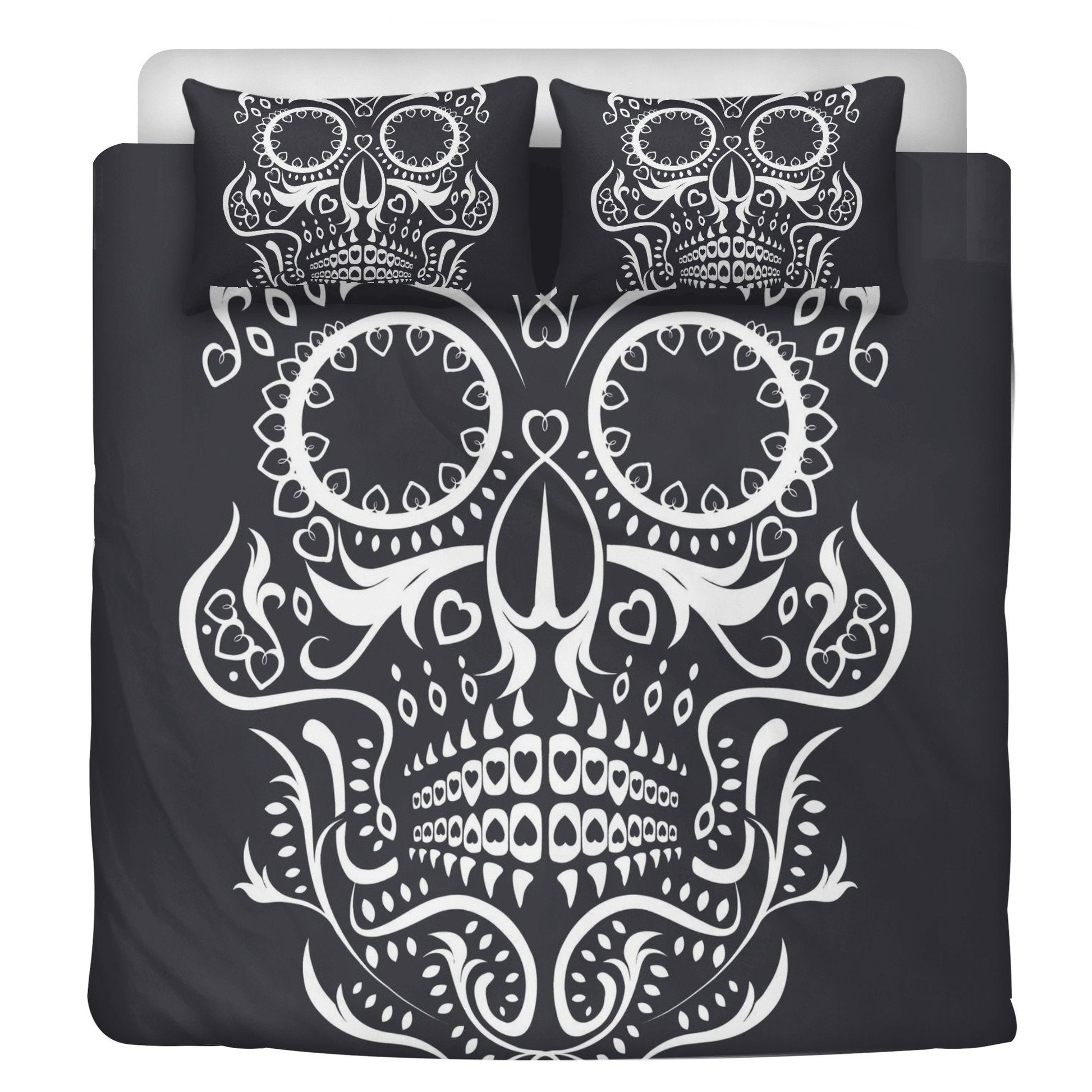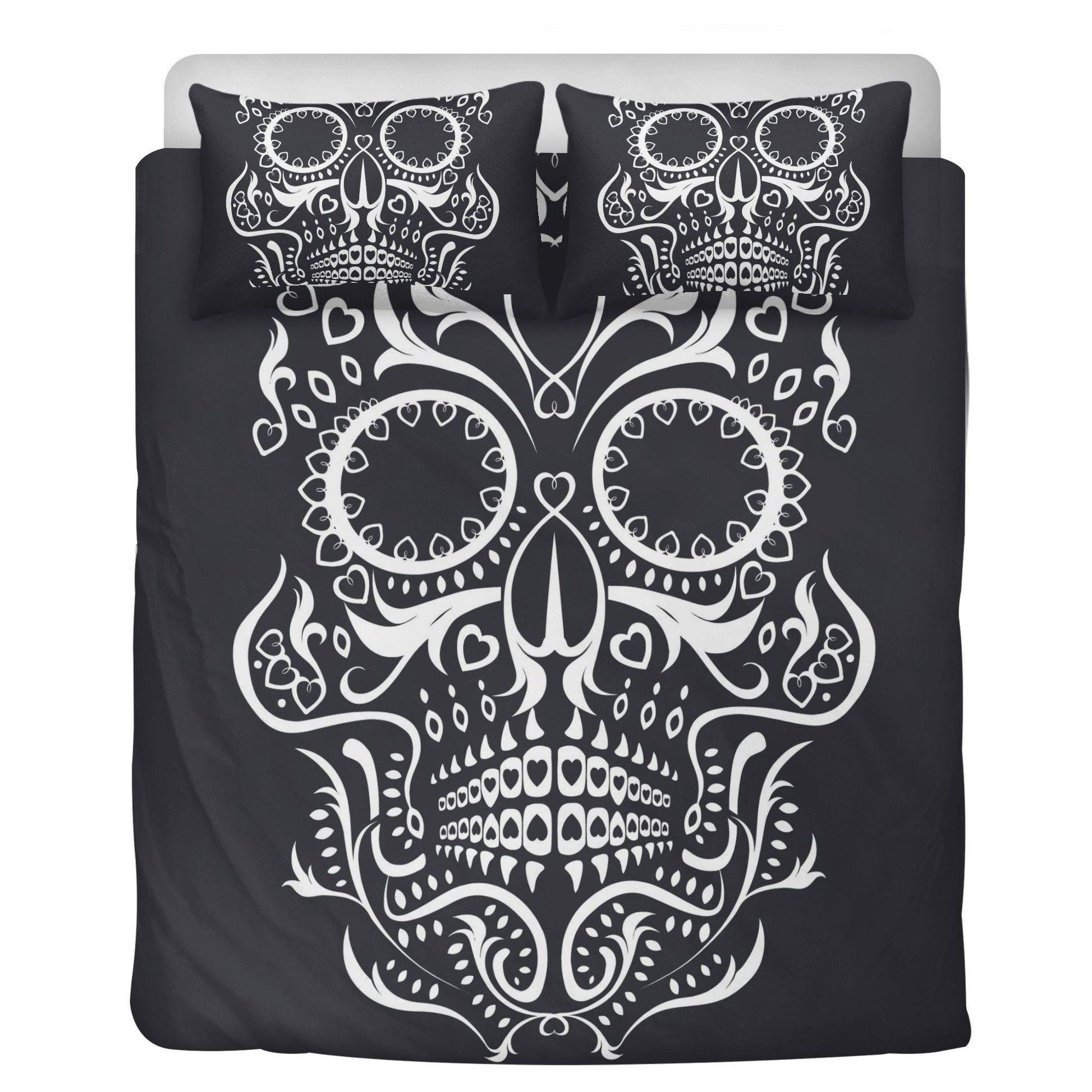 4pcs Floral sugar skull bedding duvet cover set, day of the dead skull candy skull bedding set, sugar skull duvet cover set pillow covers dia de los muertos sugar skull duvet cover pillow covers Washable and durable;Close skin fabric;Non-irritating;Good moisture absorption and breathability; Made of polyester Product includes one zippered duvet cover, one sheet and two pillowcases, inserts not included. Feature:Healthy Printing and Dyeing Care Instruction: machine washable use a mild detergent. Thread Color is white. Custom area is Single-sided printing. This product is made on demand. No minimums. Multiple shipping options available, and cost varies on time efficiency. Size unit inch Size_Detail_____UST__________USF__________USQ_________USK___________USC Quilt Cover_____67.7x85.8___79.9x89.8___89.9x89.9___102.4*90.6___103.9x94.1 pillowcase______19.7x28.3___19.7x29.5____19.7x29.5_____20.1x35.4____20.1x35.8 Sheet___________66.9x90.6___82.7x90.6___90.6x98.4___98.4x106.3___92.1x98.4 ======== All products in our store are only manufactured upon receiving an order from the customer. Please carefully review the product description and dimensions in the illustrative images before placing an order. The following cases are not eligible for return/exchange: 1. The product you receive matches the description. 2. The product dimensions (with illustrative images describing the dimensions) you receive match the description. 3. The product has been customized as per your request (e.g., printed with your name/image).