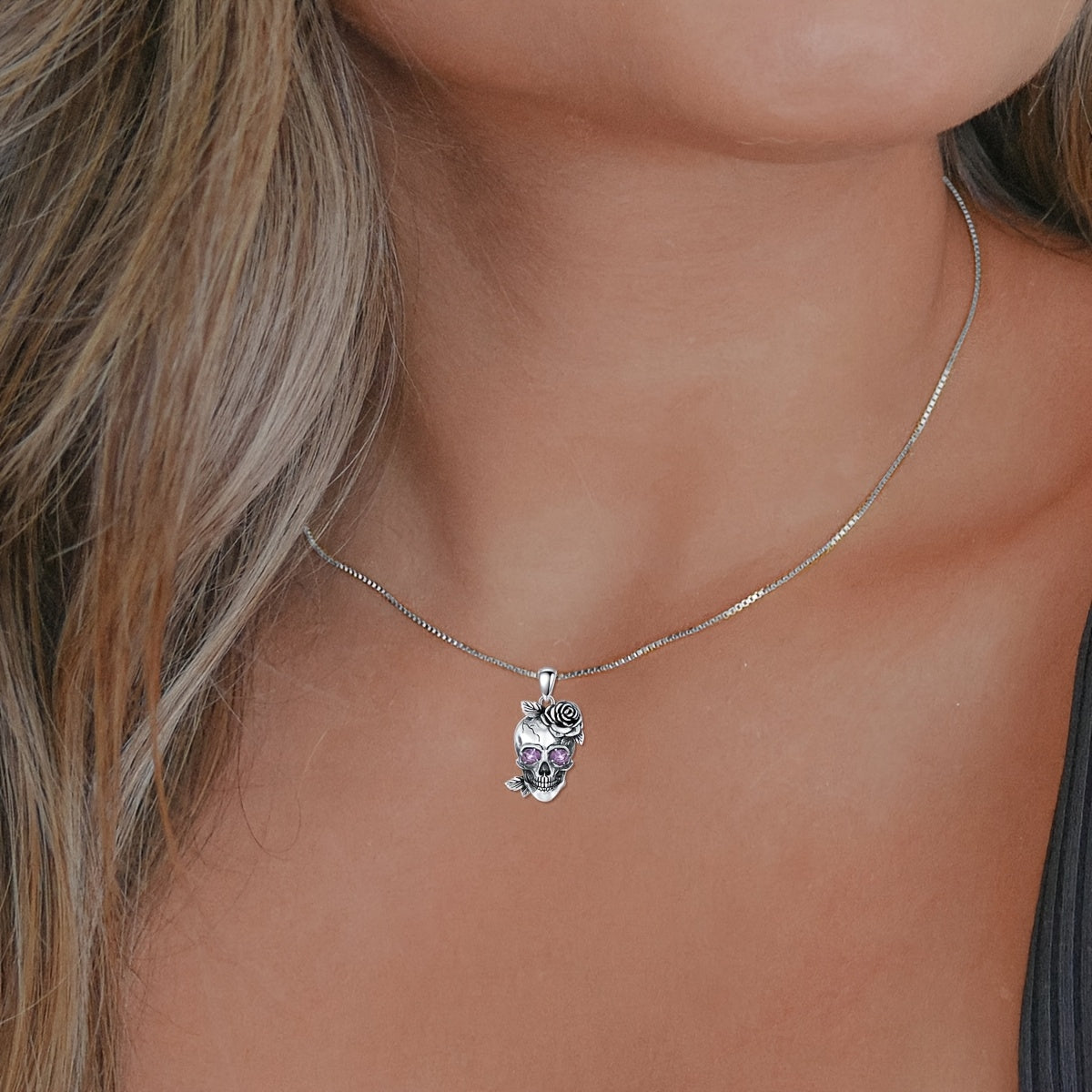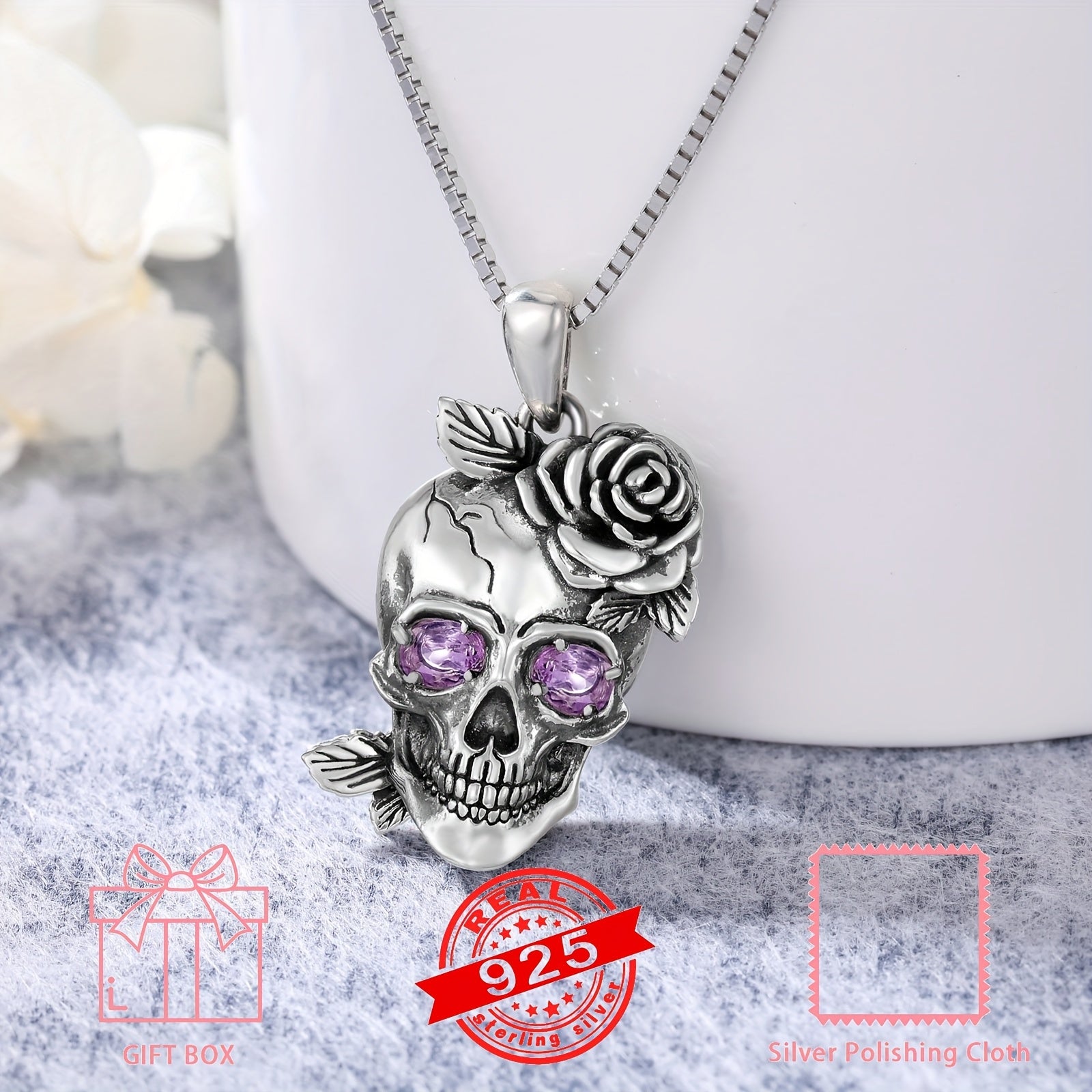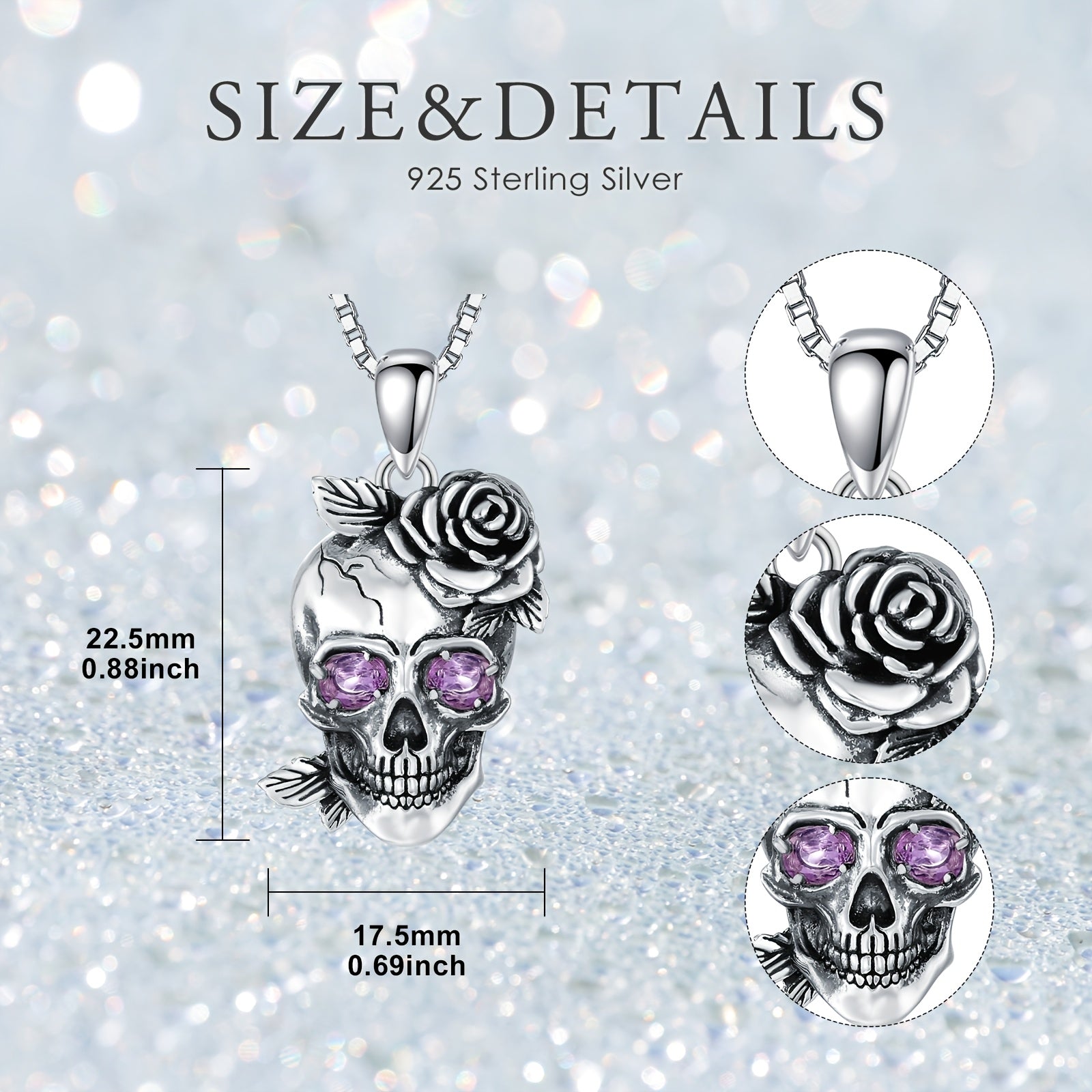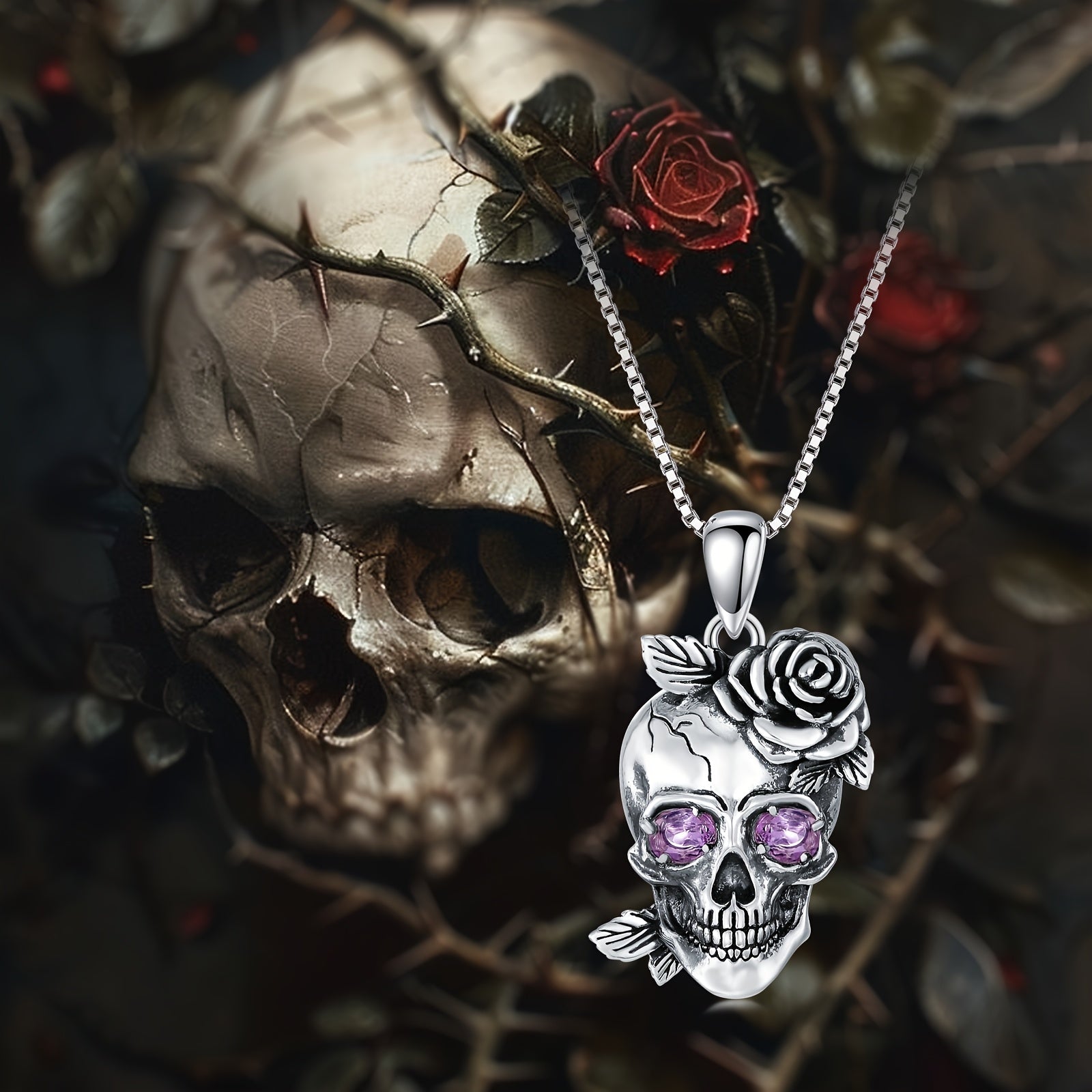 Amethyst Skull Necklace 925 Sterling Silver Gothic Rose Flower Skull Bone Pendant Necklaces Halloween Jewelry Birthday Gifts for Women