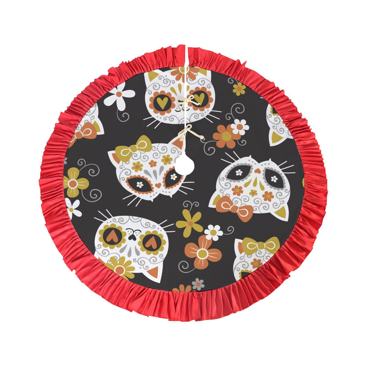 Cat sugar skull Red Christmas Tree Skirt, Floral sugar skull pattern Red Christmas Tree Skirt